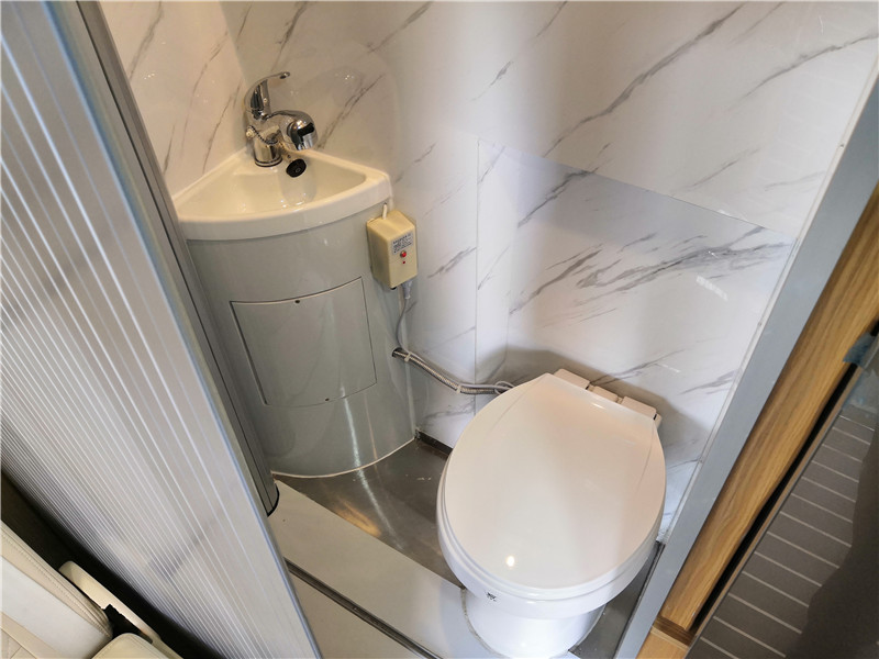 再往后是卫生间区域,卫生间采用卷帘式设计,安装了固定式马桶、可伸缩沐浴喷头。