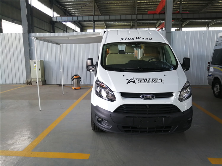 福特新全顺.特有的福特标志.两边犀利的鹰眼大灯彰显着百年福特的霸气.整车黑白两色 底部黑 上方白配合使车辆看上去美观而不失单调.左右车门两边的流线型后视镜风阻小后视范围广是一台您值得拥有的房车