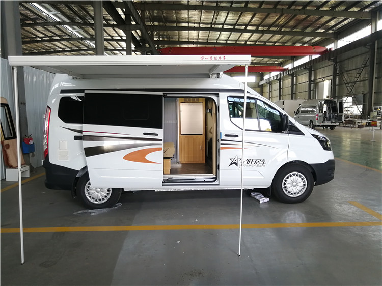 房车的中门 下面是电动脚踏板 上面有遮阳棚.