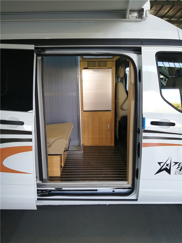 房车的后横床.是一张双人床.床下面就是房车的行李舱.该行李舱是一个通舱 两边都开有舱门取放物品都很方便.