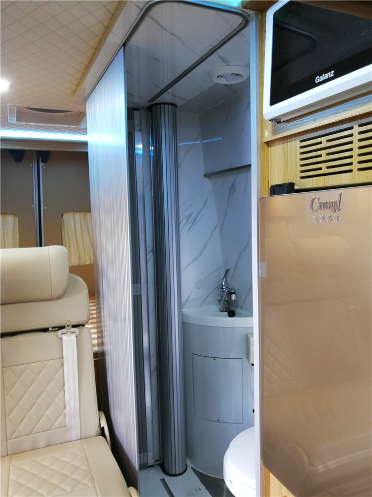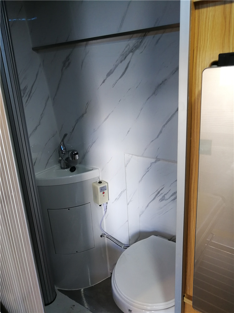 该车采用卷帘式卫生间 卫生间底座是真空吸塑而成的部件,坚固耐用,连体性好,不用担心漏水。