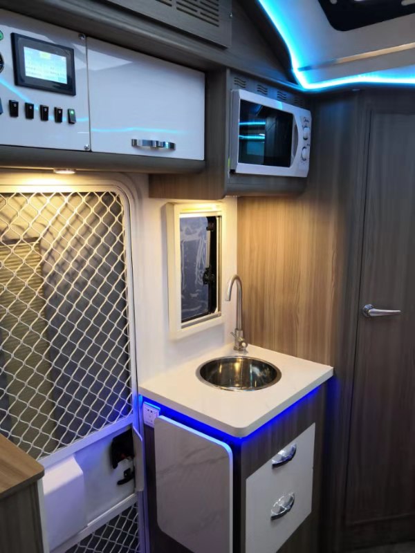 车的顶部星空顶/九宫格+LED氛围灯,进入车内是否有中家的感觉呢?特有的星空顶总会让人浮想联翩,驻车野外外面一个星空里面一个星空,你可以什么都想也可以什么都不用想。这大概是房车该有的生活体验吧。