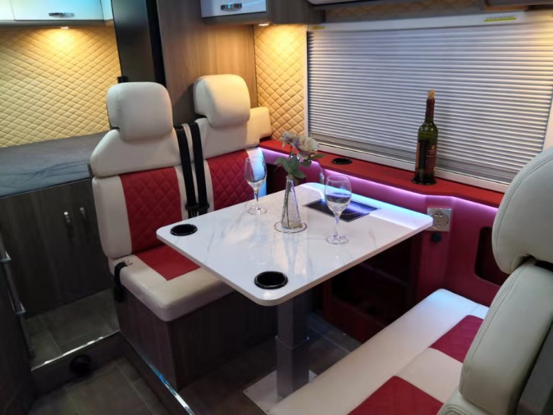 会客区域双人对卡坐沙发,中间是个手动升降式餐桌+被托架+电磁炉,餐桌降下来可以和卡座拼齐形成一张卡座变床1900x1000mm,在房车里也能肆意翻腾。可以接待三两好友在此喝茶,聊天,打打牌,休闲娱乐,坐在卡座区还可以收看电视带来的精彩节目。
