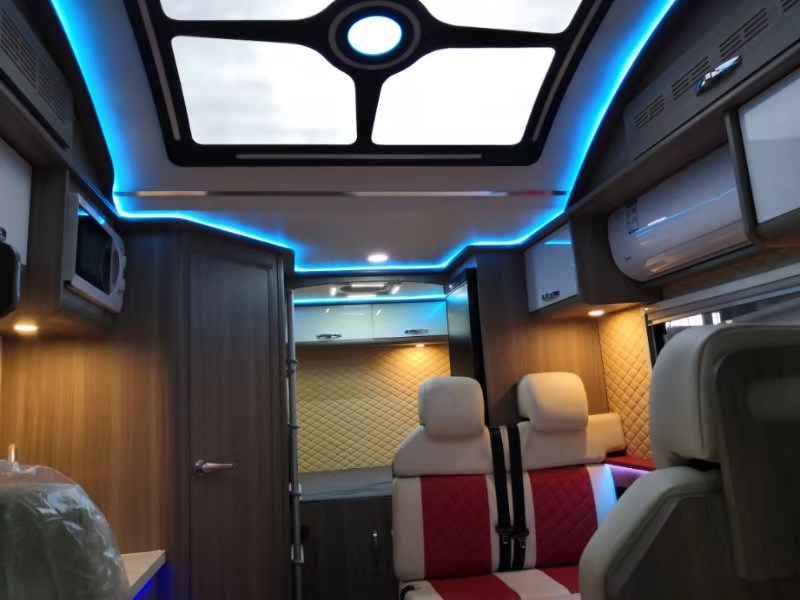 车内顶部星空顶/九宫格+LED氛围灯。特有的星空顶总会让人浮想联翩,驻车野外外面是一个星空里面是一星空,和家人们·相约星空下,你可以什么都想也可以什么不想,这大概是房车人该有的生活吧。,
