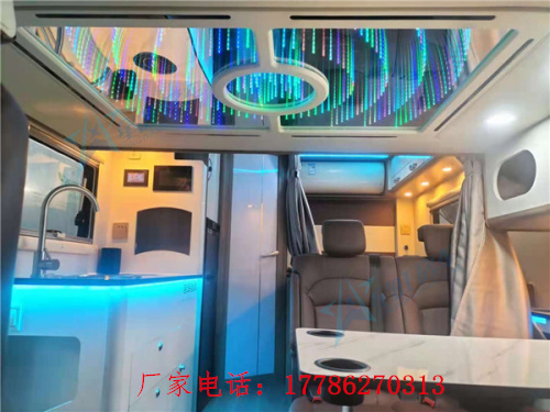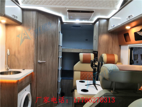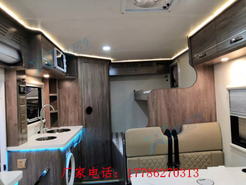 厨房区域配有电磁炉、微波炉、95L冰箱,卫生间装有10L燃气热水器、进口多美达抽拉带旋转式马桶。不锈钢净水箱为300L,不锈钢污水箱为85L,装有1000A锂电池,3000W逆变充电一体机,可以说是水电无忧了!