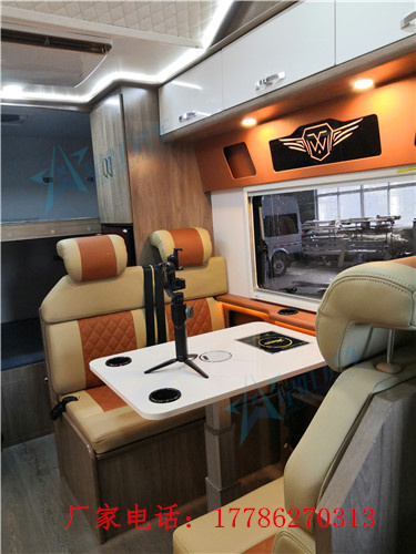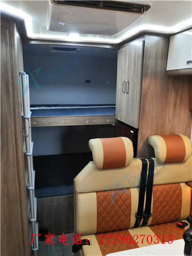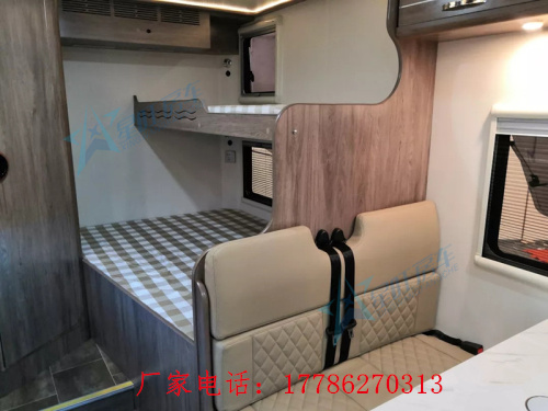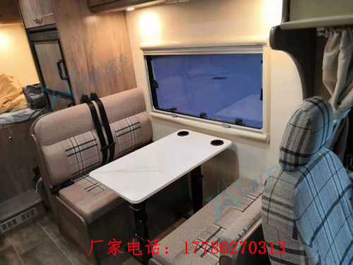 卡座区采用的是一个双人对坐座椅,配有三点式安全带可以保证行车安全,中间配置了一张手动升降桌,将升降桌降下后可与座椅拼成一张1500mm×1100mm的儿童床,中部升降床尺寸为2100mm×1200mm,纵置床尺寸为1950mm×1200mm。