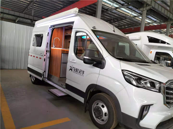 这款大通v90是目前房车市面上B型房车里的一款房车,此款大通v90房车,采用加长轴高顶底盘,轴距为3760mm,整车的尺寸为5940+2110+2535mm,还可以选装超高顶2755mm。车侧身配有电动踏板,手动遮阳棚+LED户外灯。