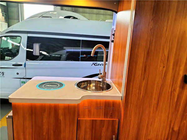 厨房吧台,装有不带盖子不绣钢的洗菜盆,800W电磁炉,50L冰箱,上面是12V底置空调。