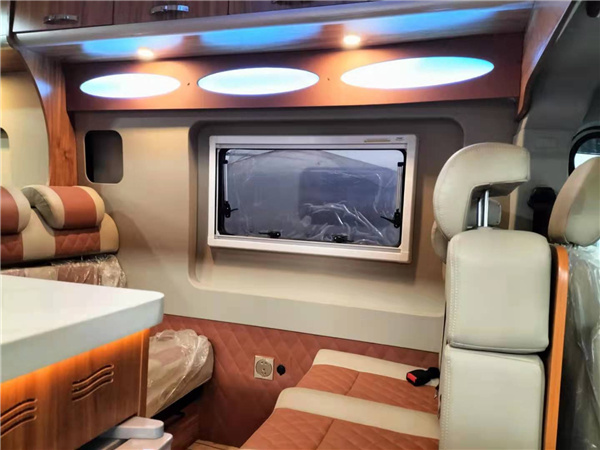 会客区域,4人卡坐沙发,可变为卡坐变床,卡坐上方装有手动外推窗,上拉防蚊,下拉遮阳。