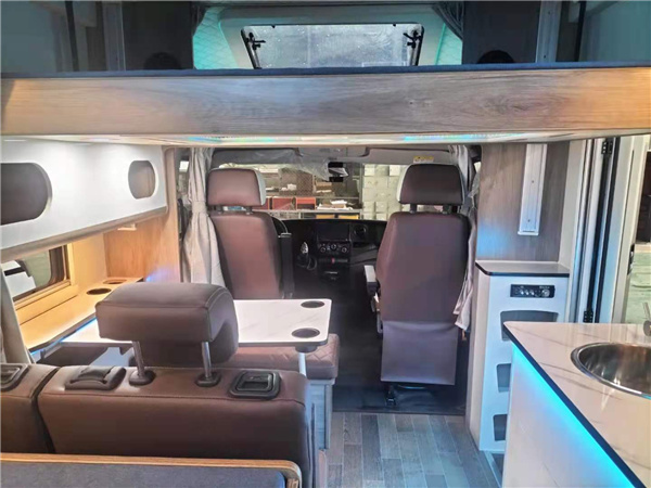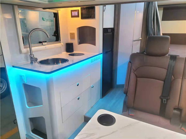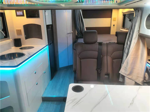 整车车内风格清新自然,多采用生态板材家具,简约自然、清新舒雅。搭配房车专用地板革、组合式吊柜,居家空间在暖黄色的氛围灯的衬托下,显得尤为浪漫温馨。合理的空间安排让这款车不仅仅外部颜值高,内部也是如家一般美好,即使没有拓展,车内的空间也很大,生活区设施齐全,分别电动升降床休息区、会客区、厨房、卫生间、纵置床组成。