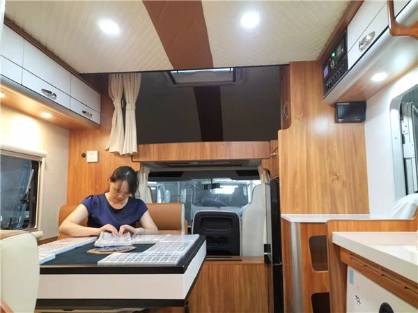 驾驶室上方配有额头床2260x1600mm,额头床旁边还设有32寸液晶电视,避免旅途行车无聊。坐在会客区和家人一收看娱乐节目。额头床旁边配有12v133L节能双开门冰箱,冷冻+冷藏,可以满足日常出行带3-5天的食物+蔬菜都是没问题。