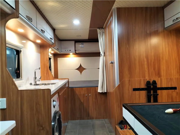 厨房区域位于车门左侧,防大理石吧台,吧台上配有不绣钢洗菜池,800w电磁炉,火星人集成灶+抽烟机,方便旅途中也可也吃到美味可口的饭菜,给自己家一般的温馨。下方厨房配有3kG滚筒洗衣机,模拟手搓洗净度均匀。