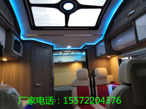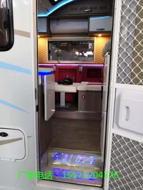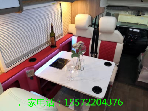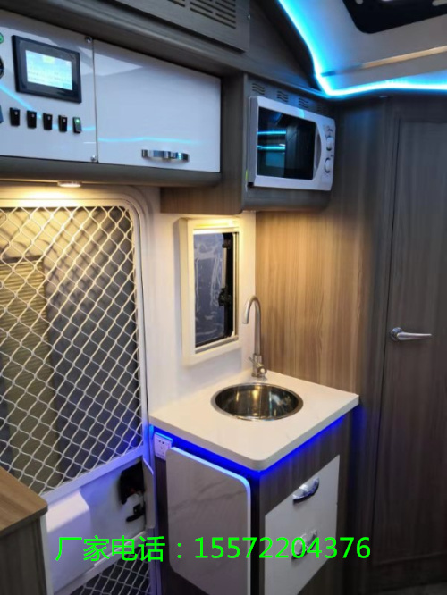 从车门进入左手边是一个厨房吧太,空间不大因此设计了可折叠桌板增加使用面积、不修钢洗菜盆、橱柜、吊柜等基本设施;吧太上方微波炉组成的立柜,可放置食材加热食物。