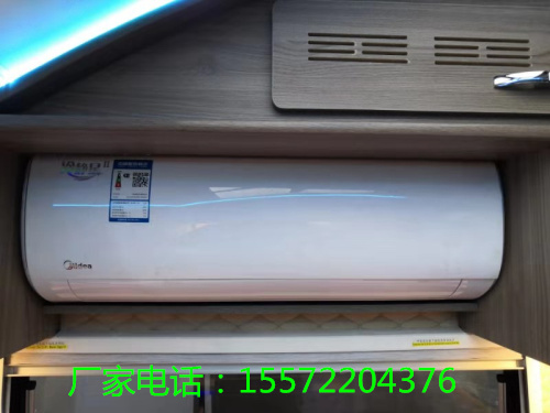 会客区双人对卡座沙发,中间是张手动升降式餐桌,通过降低升降桌,该区域可以变成一张卧床,铺上褥子以后,平整度还是可以的。餐桌上配有电磁炉,在外部天气不好的情况下,可在车做简餐,煮面条,煮饺子,煮火锅都很方便,卡座沙发上方依旧是三个储物柜,下方的外推窗,可以随时欣赏车外美景,顶部配有美的一级变频空调,使用美的空调,可以很快的调节车内温度,而且静音性确实不错。