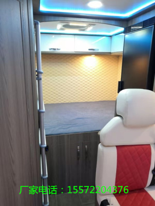 驾驶室上方是顶置双人床,采用软包材质,不过两侧配有外推窗,躺在床上也可以查看车外情况。床位位置比较高,配有爬梯使乘客上下床轻松自如。