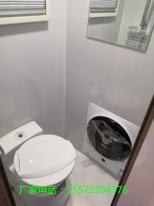 厨房旁边一体式卫生间,内部配置比较齐全,多美达抽拉盒式马桶、一体式洗手池、抽拉式水龙头等配置还是齐全的。这款房车采用了燃气热水系统,还配有3Kg洗衣机,在旅途中从此解放您的双手。