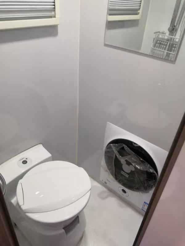 固定式卫生间配备相当齐全,多美达抽拉盒马桶,一体式洗手池抽拉淋浴花洒,毛巾架,浴室镜,储物盒,顶部带灯双向换气扇,安装了隐私帘的外推窗,3kg洗衣机灯配置,卫生间尺寸达1米,这样宽敞的卫生间你喜欢吗。