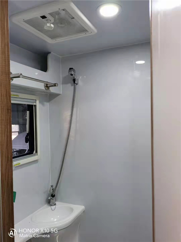 进入车内,紧挨着的便是室内厨房操作台,电磁炉、带盖洗菜池和台面一律采用黑色元素,更显质感,下方是做个组合抽屉,旁边还有房车专用冰箱,不仅更耐用,也能满足日常使用,实拍车采用了后横床的布局,驾驶室后面是车内的卡座,厨房区、固定卫浴间,尾部则是一张双人床。另外还有纵床布局。