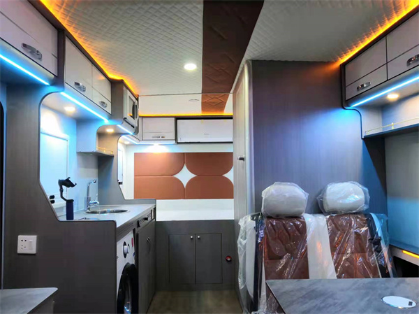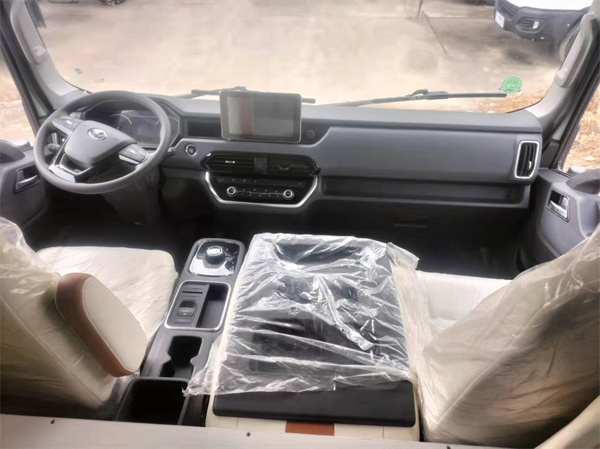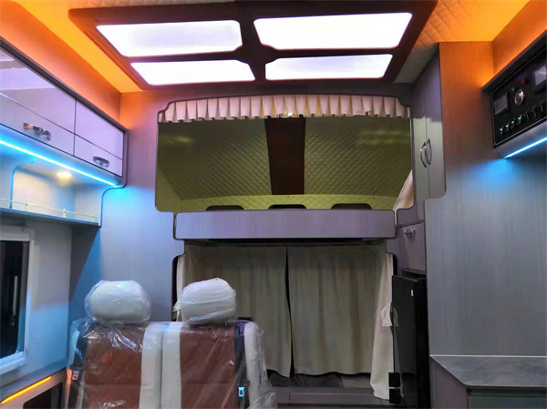 驾驶舱座椅翻折设计采用米白色配色设计,拥有高端典雅的质感。1+2的座椅设计,中间椅背翻转下去就可以变成扶手箱,方便车主放置常用的水杯等物品。主副驾驶位均配有安全气囊。安全辅助系统方面,整车配置带有车身稳定系统(ESP),预警式安全带提醒,10中控大频触摸+语音,倒车雷达,倒车影像,定速巡航,电动带加热外后视镜等,让车主驾驶房车更加轻松,车主还可以根据自己需求选配智能安全包(AEB+LDW+ACC),BSD 盲区监测+LCA 变道辅助等。