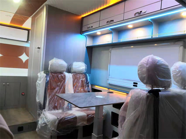 会客区采用的是4人对座沙发+升降桌的设计,座椅皮革包覆,乘坐舒适。必要时可以临时拼成一张沙发床铺供人休息。会客区的侧边安装有大尺寸的观景窗,内窗带遮阳帘,防蚊帘,为会客区带来明亮光线。上方采用镂空设计储物格,在驻车时放零食水果等,吊柜储物柜组合可存放日常用品。